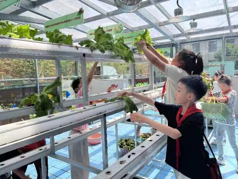 為了回應(yīng)學(xué)生的好奇心和求知欲,創(chuàng)新街小學(xué)根據(jù)學(xué)生的興趣點(diǎn),設(shè)計(jì)了分級(jí)實(shí)施的“點(diǎn)”課程。如圍繞智慧種植這一“點(diǎn)”,學(xué)校推出了“集裝箱式植物種植”“全天候智能育苗室”“植物實(shí)驗(yàn)室”等課程。學(xué)生親身參與播種、觀察、照料、收獲、分享及調(diào)研等勞動(dòng)實(shí)踐環(huán)節(jié),不僅掌握了全自動(dòng)化的種植技術(shù),還深刻體會(huì)到科技在優(yōu)化勞動(dòng)過(guò)程中的重要作用。