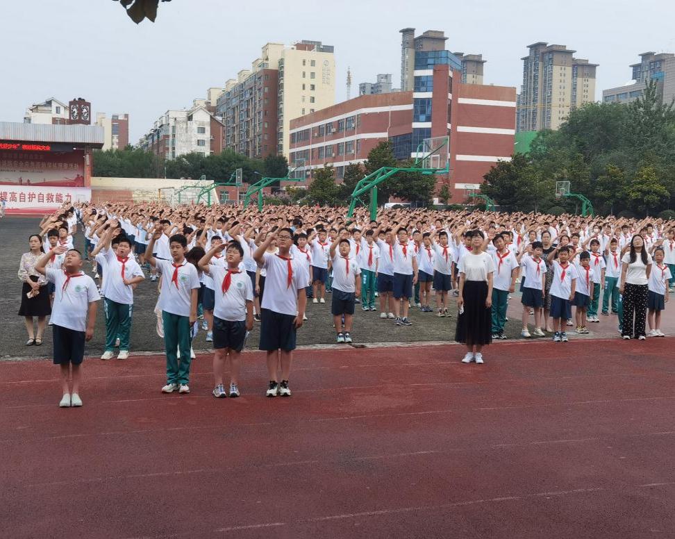 萬里江山披錦繡,國旗漫卷寄深情。伴隨著莊嚴(yán)雄壯的國歌,五星紅旗冉冉升起,全體師生面向國旗行禮,共同表達(dá)對(duì)黨、對(duì)祖國的無限忠誠和熱愛。