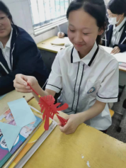 2.剪紙課。剪紙作為中華傳統(tǒng)文化的重要元素,是我們民族非物質(zhì)文化遺產(chǎn)中的典型代表之一,讓民間傳統(tǒng)藝術(shù)走進(jìn)學(xué)生,進(jìn)一步樹立了文化自信。一職高的崔娜娜、柴珊、鄭繼威等老師帶領(lǐng)學(xué)校優(yōu)秀的學(xué)生,到8中進(jìn)行剪紙、皮影戲等傳統(tǒng)藝術(shù)的講授,從剪紙的工具介紹、剪紙的方法和步驟、剪紙的注意事項、作品展示及講評,到動手對折、三折、五折、六折剪紙練習(xí),再到折蝴蝶、衣服、筆架、褲子、皇冠……一把剪刀,一張紅紙,剪藝傳情,指尖乾坤。學(xué)生反饋較好,課堂氣氛熱烈。通過學(xué)習(xí),讓學(xué)生了解中國剪紙,喜愛剪紙藝術(shù),尊重和傳承剪紙文化。同時又可以增強學(xué)生自身的動手能力,提高設(shè)計能力。每個學(xué)生都充滿了濃厚的興趣,動手、動腦、審美、創(chuàng)新等多種綜合實踐能力得到培養(yǎng),取得良好效果。