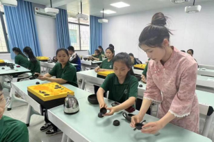 3.茶藝課。文化旅游學(xué)校陳瑾老師為13中學(xué)生送去的是茶藝課。同學(xué)們了解了茶文化,體驗了茶的泡制過程,從洗杯、投茶、沖茶、醒茶,直到品茶、回味,同學(xué)們靜心觀賞,實踐操作,在學(xué)茶、品茶、論茶的過程中,領(lǐng)略了濃郁的中國傳統(tǒng)茶文化;講授了蓋碗泡法練習(xí),蓋碗一般可用來泡紅茶、烏龍茶、黑茶、白茶和黃茶,其實除了綠茶需要使用玻璃杯沖泡,其他的茶類一般可以用蓋碗沖泡。蓋碗又稱為“三才碗”、“三才杯”,是一種上有蓋、下有托、中有碗的漢族茶具,用蓋碗品茶,杯蓋、杯身、杯托三者不應(yīng)該分開使用,否則不禮貌、不美觀,品飲時,揭開碗蓋,先嗅其蓋香,再聞茶香。飲用時,手拿碗蓋撩撥漂浮在茶湯中的茶葉,然后再飲用。同學(xué)們學(xué)習(xí)熱情高漲,掌握了蓋碗泡法的基本動作及禮儀。