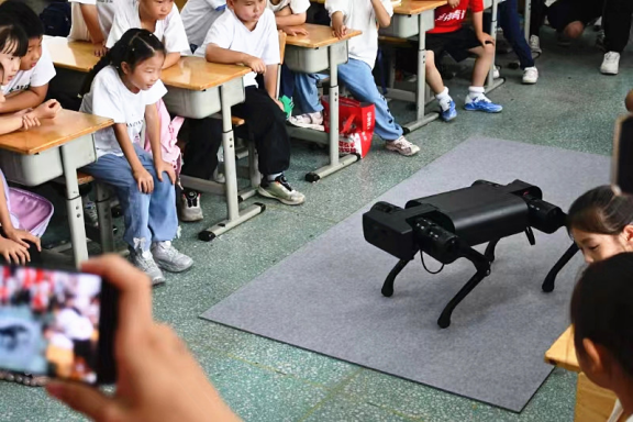 活動(dòng)中,志愿者們以風(fēng)趣幽默的方式,深入淺出地講解人工智能的奧秘。同時(shí)通過生動(dòng)活潑的游戲,將科技知識變得鮮活有趣,讓高新技術(shù)變得觸手可及。活動(dòng)現(xiàn)場,“SSR級”智能設(shè)備大顯身手,從能歌善舞的機(jī)器人到靈活避障的小車,再到人氣爆棚的“網(wǎng)紅”機(jī)器狗,無一不引發(fā)孩子們的驚呼與贊嘆。不僅讓小學(xué)生們開闊了眼界,增長了見識,也激發(fā)了大家的好奇心和探索欲。“猜字謎”互動(dòng)環(huán)節(jié)更是將氛圍推向高潮,學(xué)生們紛紛化身“學(xué)霸”,競相爭奪“AI體驗(yàn)官”榮耀,成功者得以與機(jī)器狗親密互動(dòng),大家直呼過癮。