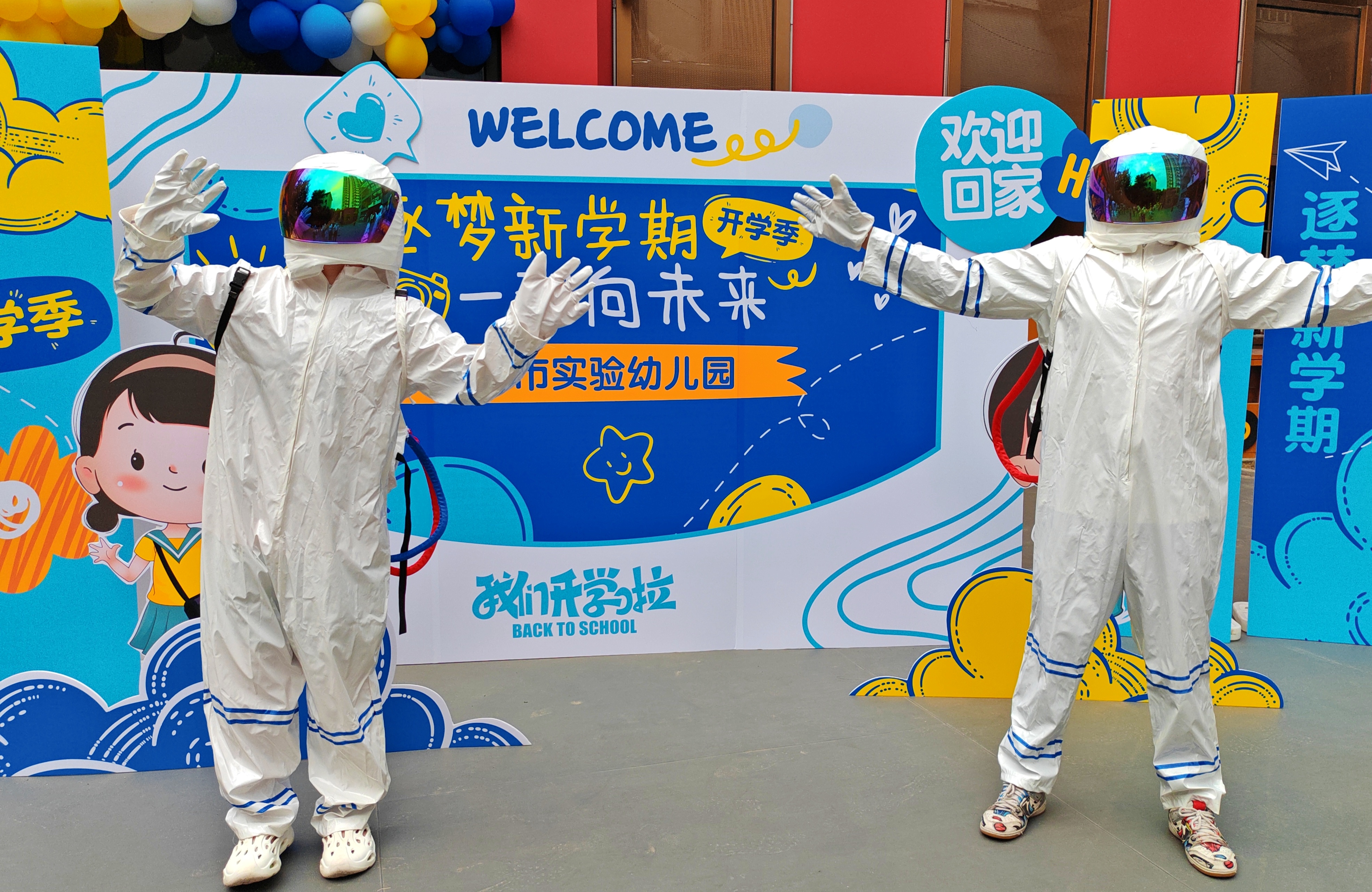 開學(xué)第一天,繽紛多彩的氣球?qū)⒊跚镉旰蟮挠變簣@裝點得分外溫馨,教師早早就在幼兒園門口做好準備。七點半左右,孩子們陸續(xù)步入幼兒園,先和帥氣的“宇航員”打個招呼,再和小伙伴在“我們開學(xué)啦”展板前合個影,讓爸爸媽媽幫忙拍一張“小小奧運健將”的照片。