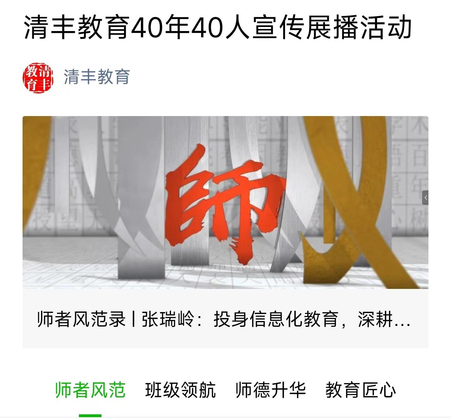 第40個教師節(jié)來臨之際,清豐縣特別推出“清豐師表40載”——清豐教育40年40人宣傳展播活動。活動共分為4個專欄,為“師者風(fēng)范錄”“班級領(lǐng)航者”“師德升華坊”“教育匠心集”四大板塊,分別展播“優(yōu)秀教師”“優(yōu)秀班主任”“師德先進(jìn)個人”“優(yōu)秀教育工作者”。