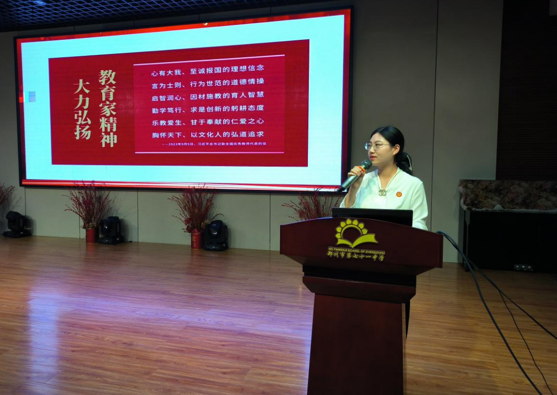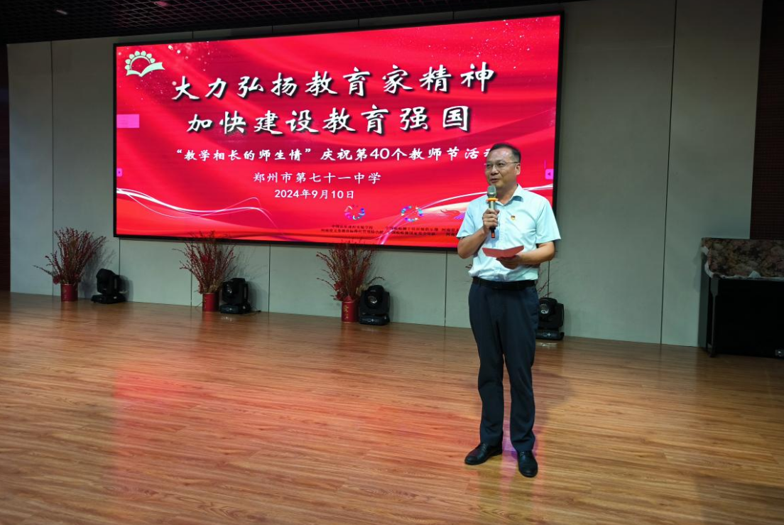 2024年9月10日,鄭州市第七十一中學開展了“大力弘揚教育家精神,加快建設(shè)教育強國”暨第40個教師節(jié)慶祝活動。弘揚教育家精神,激勵引導(dǎo)廣大師生崇德尚美、敬業(yè)立學,加快建設(shè)教育強國。