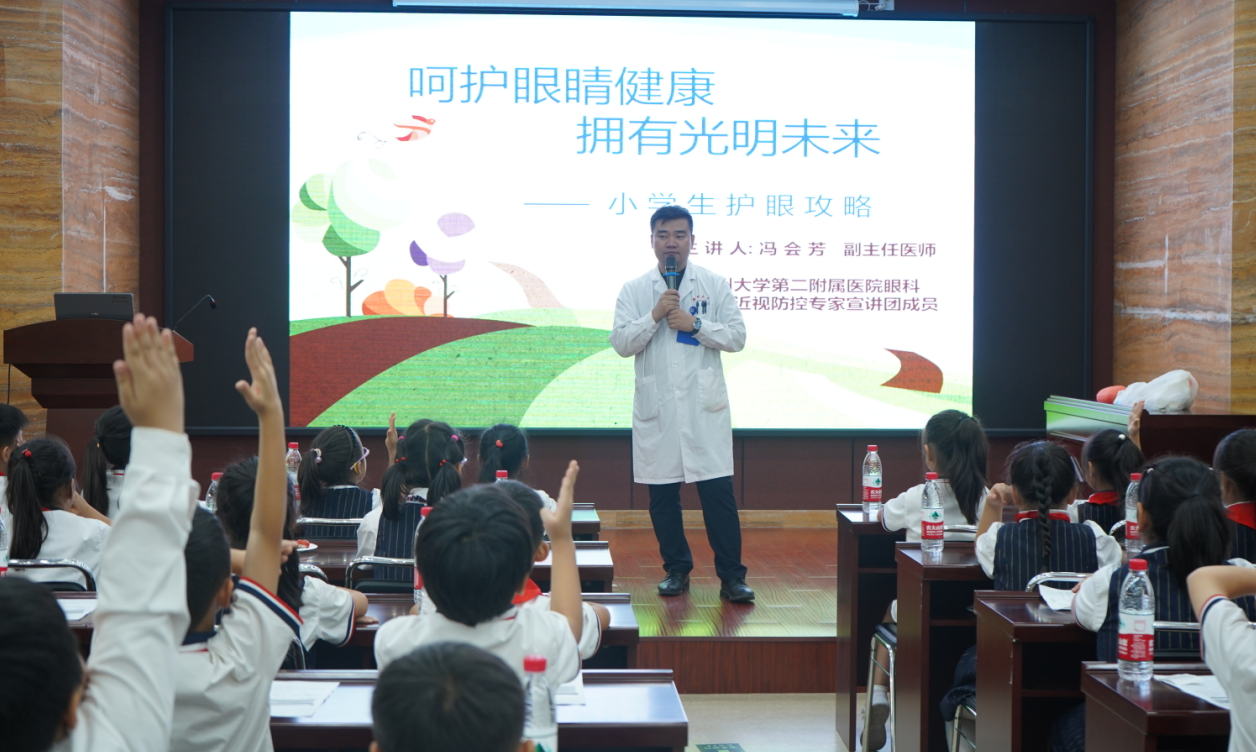 “眼睛能做什么?”副主任醫(yī)師馮會芳醫(yī)生和同學們的趣味互動開啟了護眼講座。馮醫(yī)生通過如何愛護我們的眼睛、了解近視的十大征兆、如何科學用眼等方面,引導學生掌握正確的愛眼行為。她提醒同學們,在日常生活中要注意用眼衛(wèi)生、保證充足睡眠、定期接受視力檢測。同學們聽得津津有味,積極參與互動。