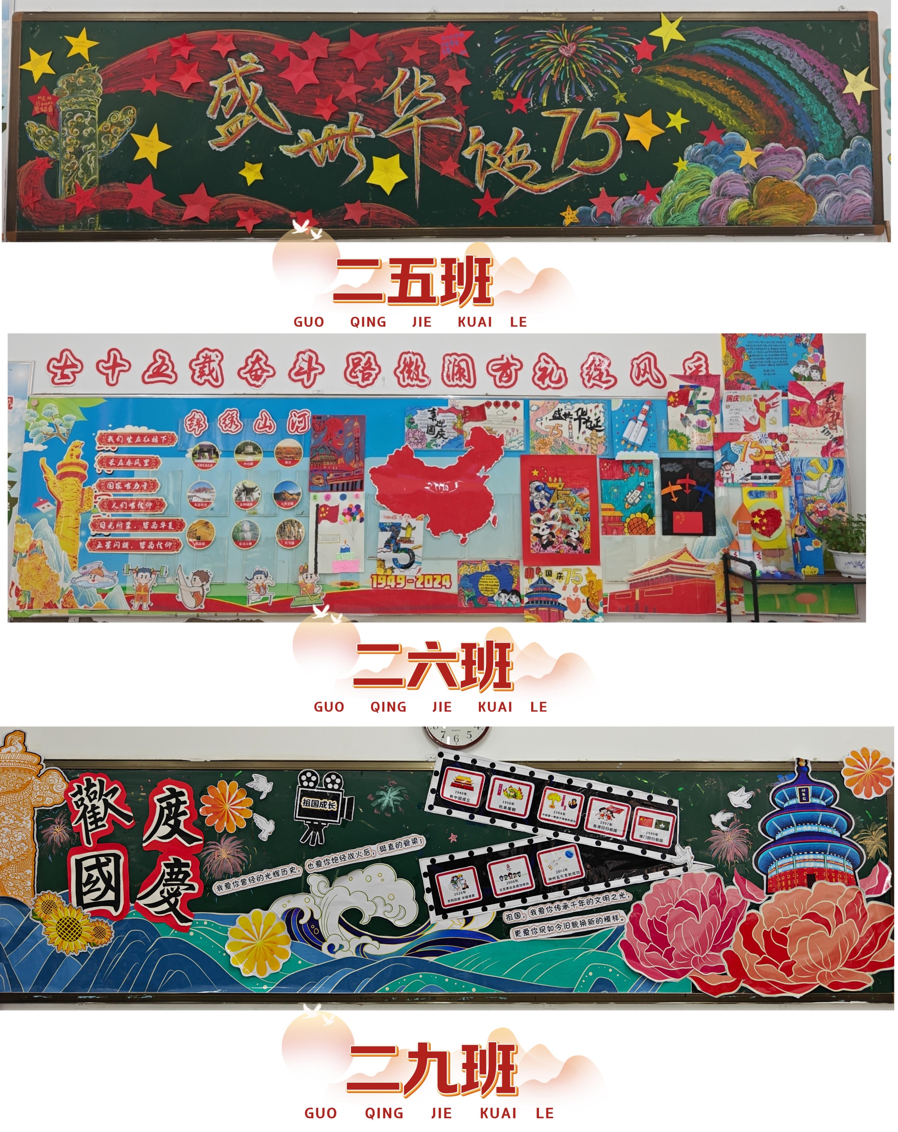 少先隊員利用課余時間,在班主任的指導下,精心策劃、細心設計黑板報的內(nèi)容。他們有的負責繪制國旗、天安門等標志性圖案,表達對祖國的熱愛與敬仰;有的則書寫著“祖國萬歲”“我愛祖國”等標語,表達少先隊員對祖國的深情祝福。