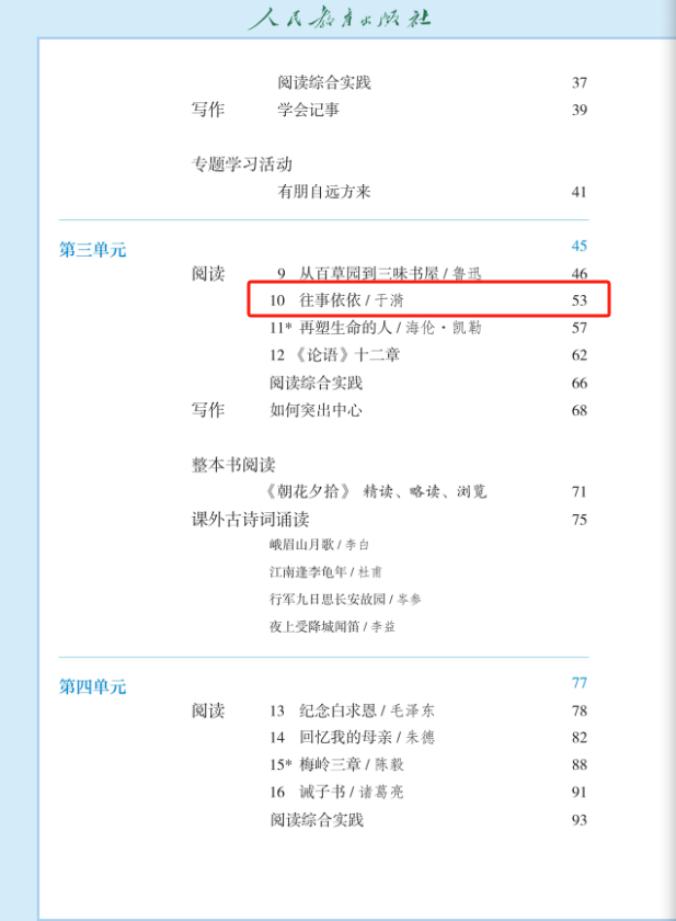 圖二:2024年新修訂的七年級上冊語文教材目錄中的《往事依依》