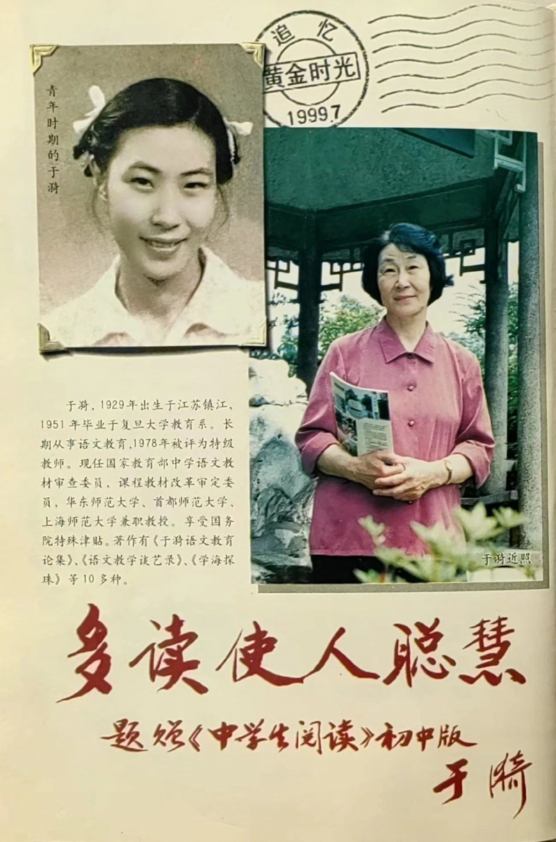圖四:當期《中學生閱讀》(初中版)封二配發(fā)的于漪老師的照片、題詞和簡介