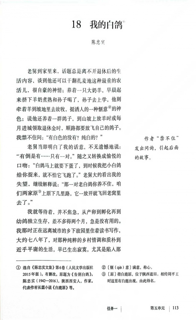 新修訂的統(tǒng)編七年級上冊語文教材僅新增三篇課文,一篇古代作品,兩篇現(xiàn)代作品。兩篇現(xiàn)代作品中,除《往事依依》系《中學生閱讀》原創(chuàng)作品外,《我的白鴿》一文《中學生閱讀》也刊登過。《我的白鴿》原題為《告別白鴿》,曾刊登于《中學生閱讀》(初中?讀寫)2018年第6期的《新課標?新閱讀》欄目“人與動物”專輯,刊登時有刪改,作者為著名作家陳忠實。《我的白鴿》編入新修訂的七年級上冊語文教材第五單元《活動?探究》中的任務(wù)一“體會人與動物的關(guān)系”,也有刪改。刪改各有側(cè)重。《中學生閱讀》(初中?讀寫)中的專輯名“人與動物”與課本中的活動任務(wù)“體會人與動物的關(guān)系”一致。下圖中,圖一為2024年新修訂的七年級上冊語文課本中的《我的白鴿》;圖二為《中學生閱讀》(初中?讀寫)2018年第6期中的《告別白鴿》。