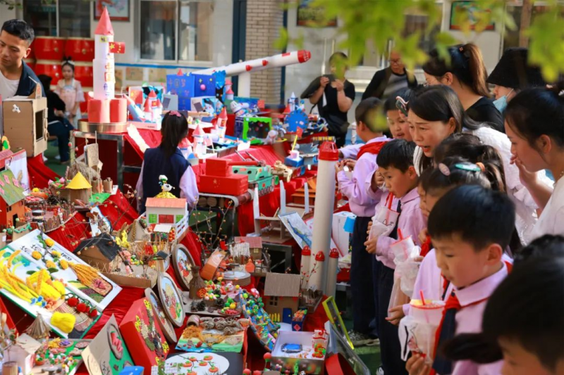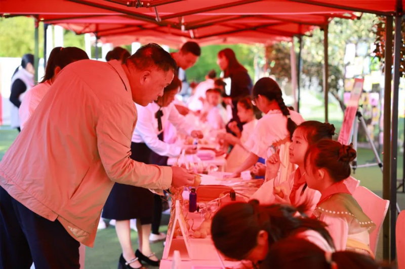 在真市集體驗(yàn)展區(qū),傳統(tǒng)手工作品、制作、體驗(yàn)、售賣(mài)等在如火如荼地進(jìn)行著,大家共同欣賞孩子們制作的扎染作品、葫蘆畫(huà)、剪紙、絨花作品,不時(shí)豎起大拇指給以點(diǎn)評(píng)和肯定。