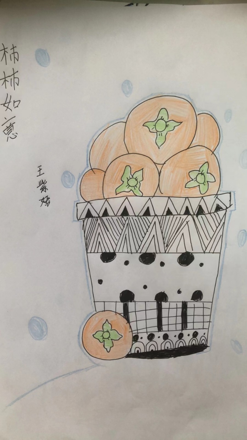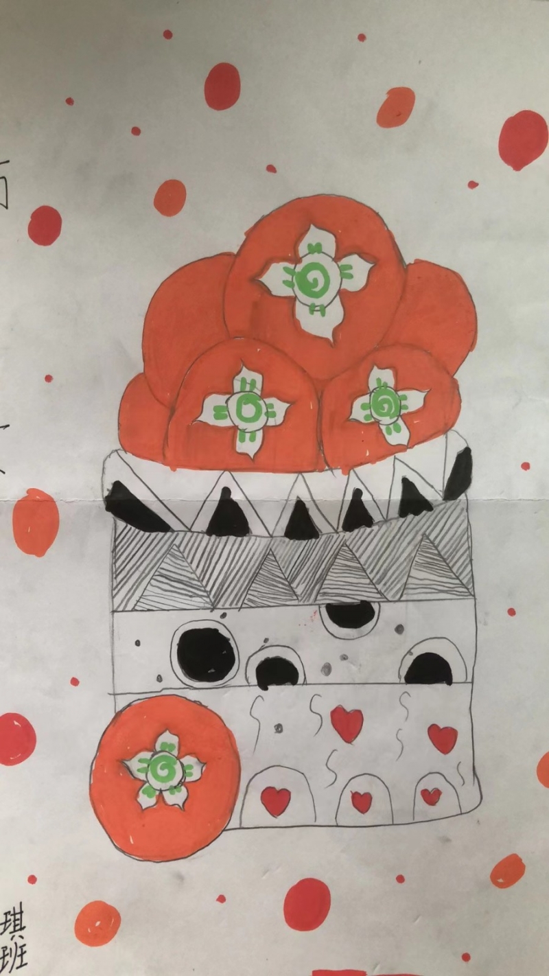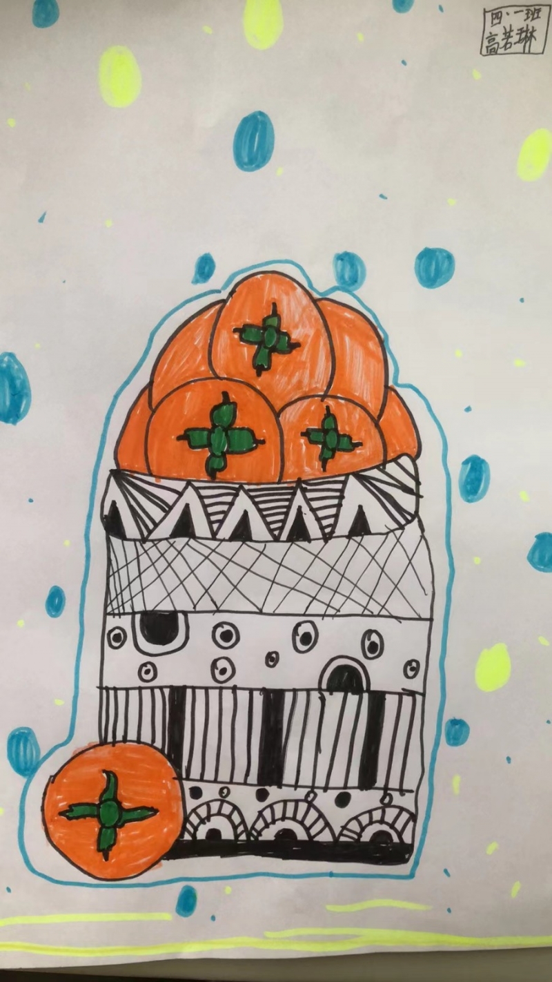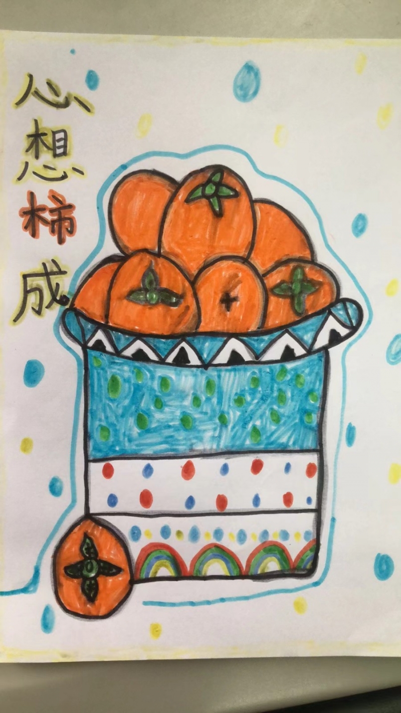 摘柿子活動(dòng)結(jié)束后,同學(xué)們將大自然的靈感轉(zhuǎn)化為藝術(shù)創(chuàng)作,用色彩描繪秋天的熱烈與豐盈,用豐富的想象、獨(dú)特的方式描繪他們眼中柿子的樣子。每一個(gè)柿子在孩子們的筆下都顯得栩栩如生——