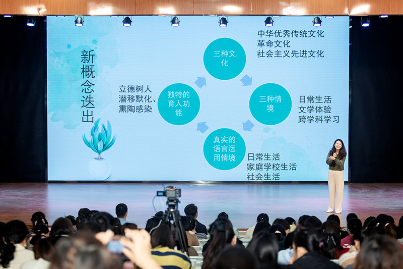 在活動(dòng)中,韓衛(wèi)娟主任為大家?guī)砹祟}為《新課標(biāo)背景下的“閱讀與鑒賞”教學(xué)》的精彩報(bào)告。講座分別從新課標(biāo)“新”在哪里、從“閱讀”到“閱讀與鑒賞”、閱讀與鑒賞·核心素養(yǎng)、閱讀與鑒賞·學(xué)習(xí)任務(wù)群、數(shù)智時(shí)代的閱讀與鑒賞等五個(gè)方面深度解讀了新課標(biāo)的創(chuàng)新點(diǎn)和變革方向、鑒賞在閱讀教學(xué)中的重要性以及構(gòu)建學(xué)習(xí)任務(wù)群來優(yōu)化閱讀與鑒賞教學(xué)策略方法。在互動(dòng)環(huán)節(jié),參會(huì)教師踴躍提問,積極交流,紛紛提出了自己在教學(xué)中的疑問與困惑,韓衛(wèi)娟主任逐一耐心解答、釋疑解惑。