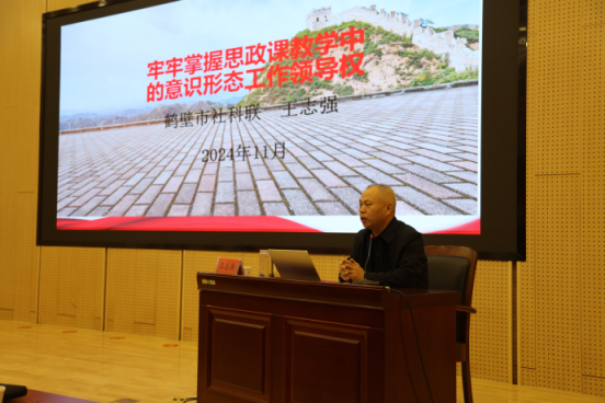鶴壁市社科聯(lián)黨組成員、副主席王志強以《牢牢掌握思政課教學中的意識形態(tài)工作領導權(quán)》為題,結(jié)合自己多年的工作體會,對思政課教師提出四條建議:一是堅定主心骨,牢牢把準校正政治方向?qū)颍欢浅懼餍桑卫戊柟虊汛笾髁魉枷胼浾摚蝗墙∪熑沃疲卫螇壕o壓實工作責任機制;四是統(tǒng)籌“一盤棋”,牢牢構(gòu)建意識形態(tài)工作格局。該報告主題鮮明,實用性強,對于思政課教師牢牢把握教學中的意識形態(tài)工作領導權(quán)有著豐厚的教益和啟發(fā)。