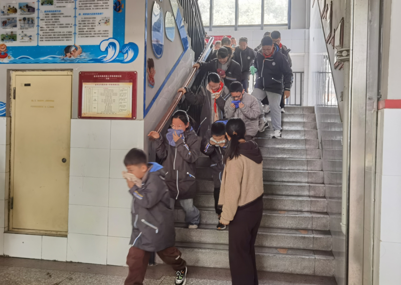 隨著警報聲在校園內驟然響起,消防演練正式拉開序幕。原本安靜有序的教學樓瞬間進入緊張狀態(tài),各班級學生在正副班主任的引導下,迅速用濕毛巾捂住口鼻,彎腰低姿沿著預定的疏散路線快速撤離。在疏散過程中,同學們表現(xiàn)出了極高的紀律性和應急反應能力,沒有出現(xiàn)驚慌失措、推擠踩踏等現(xiàn)象,各個樓梯口都有負責引導的老師,確保疏散通道暢通無阻。