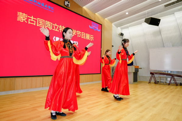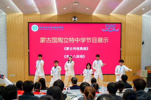 儀式上,鄭州鐵路職業(yè)技術(shù)學(xué)院國際教育學(xué)院學(xué)生表演了古箏演奏《戰(zhàn)臺風(fēng)》、二胡演奏《賽馬》。蒙古國陶立特中學(xué)學(xué)生帶來了蒙古傳統(tǒng)舞蹈和“養(yǎng)生八段錦”表演。