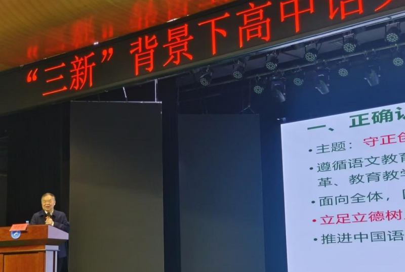 專家講座環(huán)節(jié),人民教育出版社編審、中國(guó)教育學(xué)會(huì)中學(xué)語(yǔ)文教學(xué)專業(yè)委員會(huì)原理事長(zhǎng)顧之川以《新時(shí)代背景下的語(yǔ)文老師學(xué)科素養(yǎng)與讀寫(xiě)教學(xué)》為題做專題講座,強(qiáng)調(diào)語(yǔ)文教育要守正創(chuàng)新,回歸語(yǔ)文教學(xué)本質(zhì),培養(yǎng)關(guān)鍵能力,落實(shí)“三新”要求。