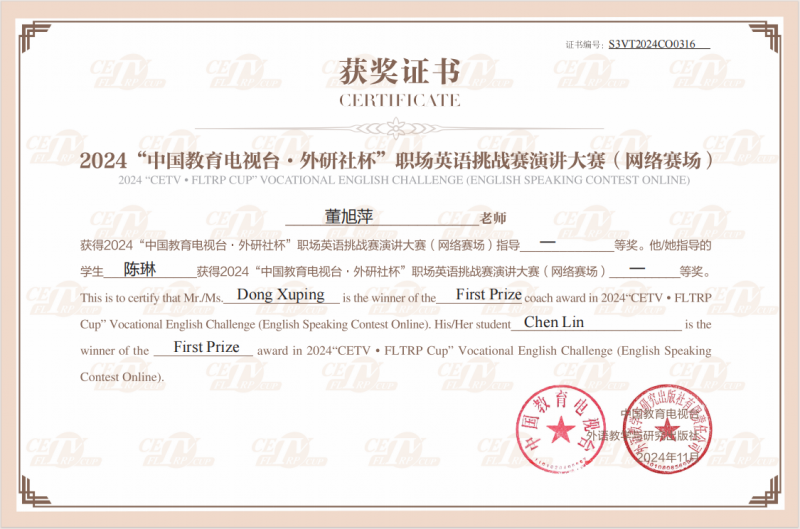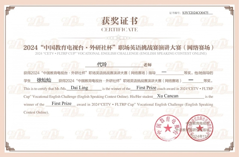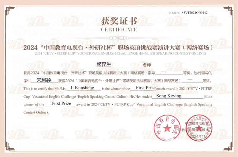 近日,“中國教育電視臺·外研社杯”職場英語演講挑戰(zhàn)賽網(wǎng)絡賽場決賽成績揭曉,平頂山職業(yè)技術學院外語系組織參賽的五位選手(宋珂穎、李東東、陳琳、徐燦燦、李晨紅)全部榮獲一等獎。