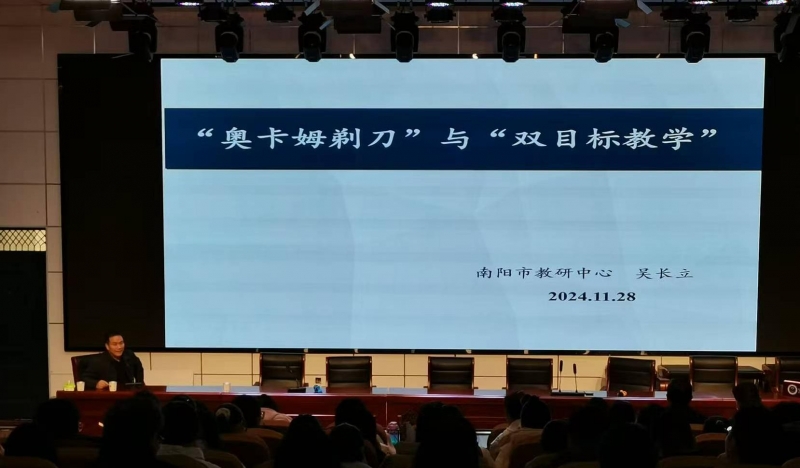 南陽(yáng)市教育科學(xué)研究中心副主任吳長(zhǎng)立帶來(lái)以“奧卡姆剃刀”與“雙目標(biāo)教學(xué)”為主題的精彩報(bào)告。吳長(zhǎng)立運(yùn)用生動(dòng)的課堂實(shí)例,深入淺出地解析了“奧卡姆剃刀”原則在教學(xué)中的巧妙應(yīng)用,并詳細(xì)闡述了如何實(shí)施“雙目標(biāo)教學(xué)”。教師細(xì)心聽(tīng)講,認(rèn)真記錄,現(xiàn)場(chǎng)學(xué)習(xí)氛圍濃郁。參會(huì)教師紛紛表示,此次報(bào)告會(huì)讓他們受益匪淺,決心在今后的教學(xué)中充分運(yùn)用所學(xué)知識(shí),不斷提高課堂效率,促進(jìn)專(zhuān)業(yè)成長(zhǎng)。