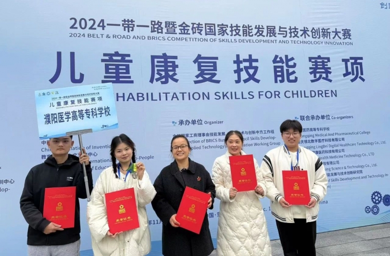 2024年11月29日至12月1日,2024一帶一路暨金磚國家技能發(fā)展與技術(shù)創(chuàng)新大賽兒童康復(fù)技能賽項(xiàng)在重慶醫(yī)藥高等專科學(xué)校舉辦。濮陽醫(yī)學(xué)高等專科學(xué)校選手在比賽中榮獲佳績,2023級(jí)康復(fù)治療技術(shù)一班學(xué)生張靈鑫榮獲言語賽道二等獎(jiǎng),2023級(jí)康復(fù)治療技術(shù)一班李小宇榮獲感統(tǒng)賽道優(yōu)秀獎(jiǎng),2023級(jí)中醫(yī)康復(fù)技術(shù)二班丁訓(xùn)獲孤獨(dú)癥賽道優(yōu)秀獎(jiǎng),邊旭昭榮獲優(yōu)秀指導(dǎo)老師,濮陽醫(yī)學(xué)高等專科學(xué)校榮獲最佳組織獎(jiǎng)。