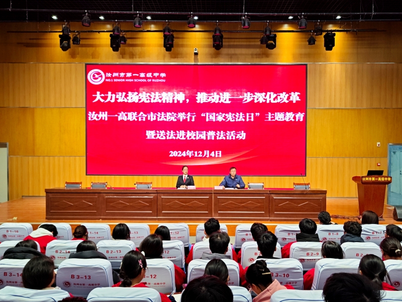 為進(jìn)一步給青少年系好第一顆"法治扣子",大力弘揚(yáng)憲法精神,12月4日,在第十一個(gè)國(guó)家憲法日之際,汝州市第一高級(jí)中學(xué)聯(lián)合汝州市人民法院開(kāi)展“國(guó)家憲法日”主題教育暨送法進(jìn)校園普法活動(dòng)。此次活動(dòng),汝州市第一高級(jí)中學(xué)特別邀請(qǐng)汝州市法院一行走進(jìn)學(xué)校,為師生進(jìn)行普法講座。