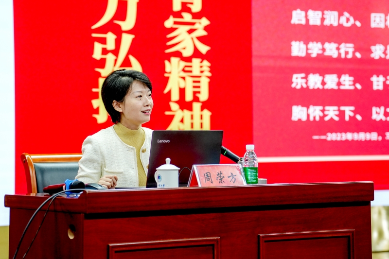 周榮方以《播種者不急于收獲》為主題,從“為什么站在講臺(tái)上”“站在講臺(tái)上講什么”“站在講臺(tái)怎么講”三個(gè)方面,用“看見·相信”闡釋至誠(chéng)報(bào)國(guó)的理想信念,用“能力·動(dòng)力”講述求是創(chuàng)新的躬耕態(tài)度,用“復(fù)制·傳承”分享言傳身教傳遞信仰的力量。她用自己深耕教壇近20年的生動(dòng)實(shí)踐,向在座師生展示了教師的“篤行”不是“獨(dú)行”,而是與學(xué)生的“同行”,人生不能復(fù)制,但是力量可以傳承的職業(yè)信仰。她以自身傳承紅色基因、踐行“教育家精神”的實(shí)際行動(dòng),感召教育工作者要做習(xí)近平新時(shí)代中國(guó)特色社會(huì)主義思想的堅(jiān)定信仰者、積極傳播者、忠實(shí)實(shí)踐者。要用更大的耐心、更多的等候,在青年學(xué)生心中播下希望的種子,做不急于收獲的播種者,讓他們的青春在全面建設(shè)社會(huì)主義現(xiàn)代化國(guó)家進(jìn)程中綻放絢麗之花!