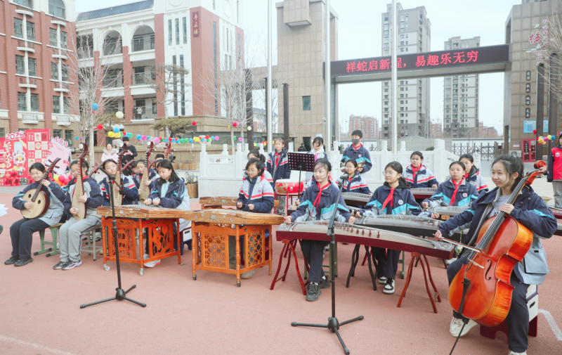 2024年12月27日下午,鄭州七中金桂校區(qū)校園里洋溢著濃厚的節(jié)日氛圍,第四屆“易趣節(jié)”如期舉行。本次活動(dòng)以“祥蛇啟新程,易趣樂(lè)無(wú)窮”為主題,旨在豐富校園文化生活,培養(yǎng)學(xué)生的綜合能力,并營(yíng)造歡樂(lè)祥和的節(jié)日氛圍。活動(dòng)在八音民樂(lè)團(tuán)的悠揚(yáng)樂(lè)聲中拉開序幕,《五星紅旗》的旋律激昂慷慨,琵琶重奏《愛(ài)我中華》激發(fā)了在場(chǎng)師生的民族自豪感。緊接著,金韻合唱團(tuán)帶來(lái)了《聽(tīng)媽媽講那過(guò)去的故事》和《一路生花》兩首歌曲,歌聲深情而動(dòng)人,喚起了大家對(duì)美好校園生活往昔的回憶和對(duì)未來(lái)的無(wú)限憧憬。