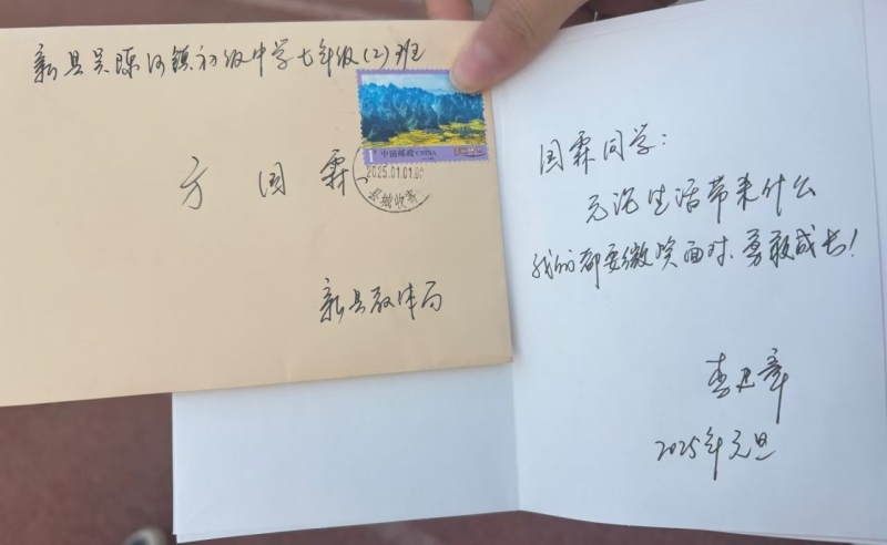 “我收到了局長(zhǎng)的新年賀卡啦!”2025年元旦后第一天,一進(jìn)班,新縣吳陳河鎮(zhèn)初級(jí)中學(xué)七(2)班的方國(guó)霖同學(xué)高興地向同學(xué)展示剛剛收到的新縣教育體育局黨組書記、局長(zhǎng)李建章寄來(lái)的新年賀卡。“國(guó)林同學(xué),無(wú)論生活帶來(lái)什么,我們都要微笑面對(duì),勇敢成長(zhǎng)!”方國(guó)霖向同學(xué)們宣讀賀卡內(nèi)容,分享自己的幸福和感動(dòng),他還說(shuō)一定要給局長(zhǎng)寫回信。