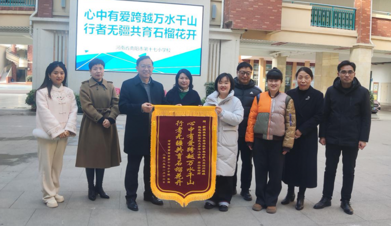 1月18日,在河南省南陽市第十七小學的操場上,一場溫情的告別正在上演。來自新疆塔城市喀拉哈巴克鄉(xiāng)中心學校的副校長兼英語老師唐山云,將一面寫有“心中有愛跨越萬水千山 行者無疆共育石榴花開”的錦旗送給南陽市第十七小學校長張哲,與朝夕相處一年的南陽市第十七小學英語教研組組長陳晨緊緊擁抱,淚眼婆娑,依依不舍。