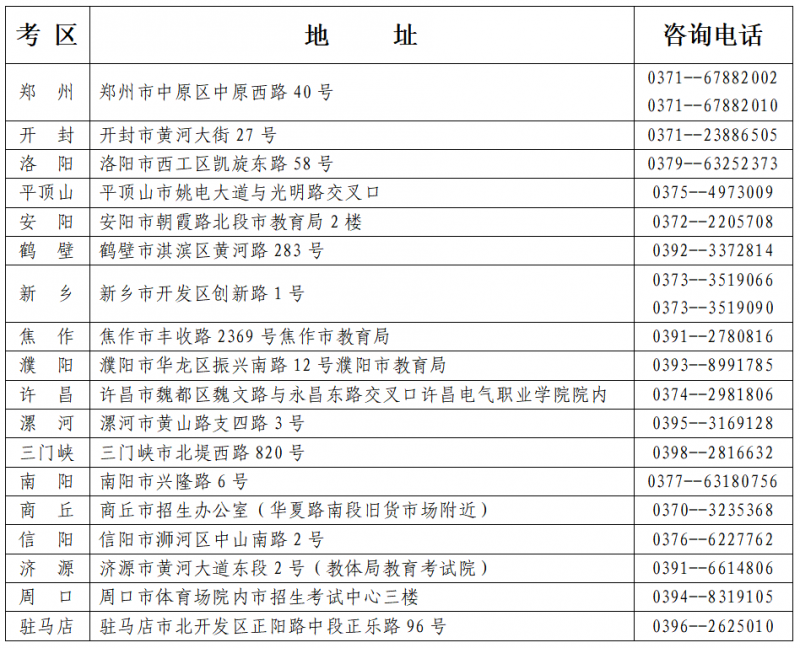 河南省自學(xué)考試各地咨詢電話及地址