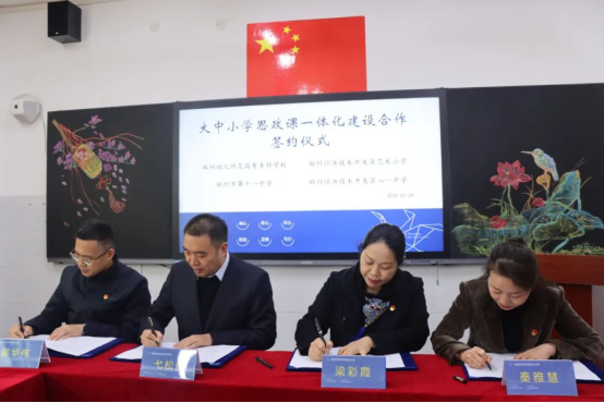 在與會(huì)代表的共同見證下,四所學(xué)校代表簽署可《關(guān)于大中小學(xué)思政課一體化建設(shè)合作協(xié)議》,明確各方將通過資源共享、合作共建,打造系列大中小學(xué)“同上一堂思政課”示范教學(xué)案例、形成一系列高水平教學(xué)研究成果、鍛造一支優(yōu)秀思政課教師隊(duì)伍,為深入推動(dòng)鄭州市大中小學(xué)開展思政課一體化建設(shè)提供實(shí)踐經(jīng)驗(yàn)和理論支撐。