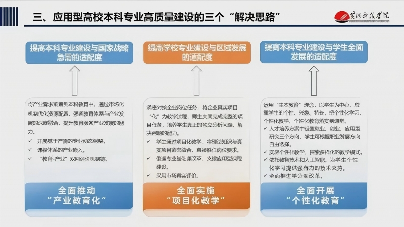 楊保成以《聚焦產(chǎn)業(yè)需求 深化綜合改革——應(yīng)用型高校本科專業(yè)高質(zhì)量建設(shè)的戰(zhàn)略思考與實踐創(chuàng)新》為題,聚焦應(yīng)用型本科高校服務(wù)國家戰(zhàn)略的專業(yè)高質(zhì)量建設(shè)要求,對目前應(yīng)用型高校本科專業(yè)結(jié)構(gòu)調(diào)整的3個突出問題,創(chuàng)新性提出3條破解路徑: