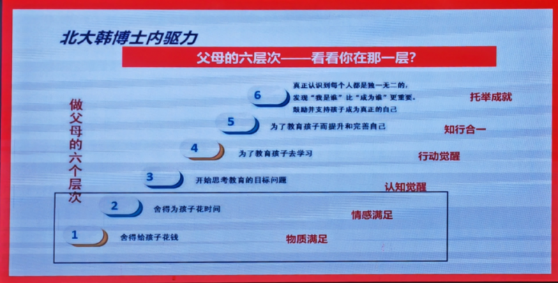 韓靜博士結(jié)合豐富的案例,耐心分析了做父母的六個層次,為在座的老師及家長們深入淺出地講解了雙極立體式內(nèi)驅(qū)力激發(fā)體系,讓參會人員收獲了科學(xué)的教育工具和激發(fā)學(xué)生學(xué)習(xí)內(nèi)驅(qū)力的方法。