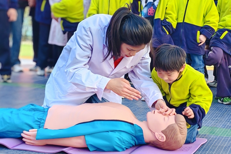 活動當(dāng)天,志愿者們將心肺復(fù)蘇(CPR)技能轉(zhuǎn)化為趣味實踐。孩子們在指導(dǎo)下學(xué)習(xí)胸外按壓操作,志愿者通過“按壓頻率與《孤勇者》節(jié)奏同步”的比喻,幫助孩子們輕松掌握急救要領(lǐng)。7歲的童童第一次完成規(guī)范按壓后,興奮地拉著志愿者的手說:“我以后也要當(dāng)醫(yī)生!”現(xiàn)場還創(chuàng)新編排了“海姆立克急救法手勢舞”,將急救步驟融入《把未來點亮》的旋律中,孩子們通過肢體語言加深對急救知識的記憶。