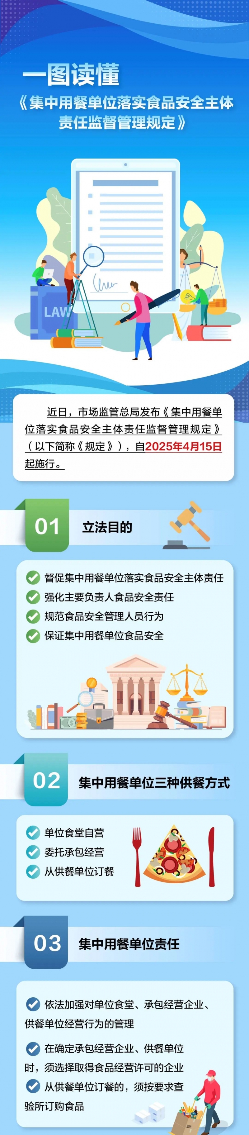 市場(chǎng)監(jiān)管總局近日發(fā)布《集中用餐單位落實(shí)食品安全主體責(zé)任監(jiān)督管理規(guī)定》,自2025年4月15日起施行。