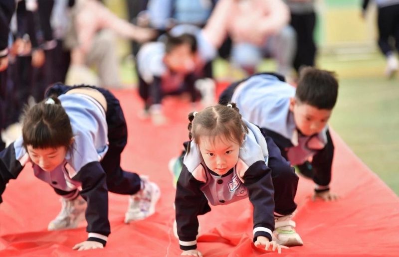 4月春風(fēng)拂過,幼兒園操場上一片歡騰。中班組的幼兒手持紅色溜溜布,在“高低穿梭”的趣味游戲中展開體能大循環(huán)。溜溜布時而舉高如“彩虹橋”,時而壓低成“匍匐隧道”,孩子們在上面進(jìn)行多項練習(xí),鍛煉其平衡與協(xié)調(diào)能力。