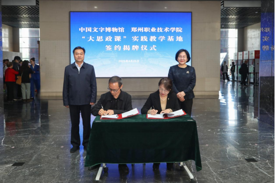 4月25日上午,鄭州職業(yè)技術(shù)學(xué)院與中國(guó)文字博物館舉行“大思政課”實(shí)踐教學(xué)基地簽約揭牌儀式。鄭州職業(yè)技術(shù)學(xué)院黨委書(shū)記呂村,中國(guó)文字博物館黨委書(shū)記、常務(wù)副館長(zhǎng)寧紅亮出席儀式,共同為學(xué)校“大思政課”實(shí)踐教學(xué)基地揭牌。鄭州職業(yè)技術(shù)學(xué)院黨委委員、副校長(zhǎng)張建偉,中國(guó)文字博物館黨委委員、副館長(zhǎng)魏文萃,黨委委員、副館長(zhǎng)韓英杰等出席儀式。