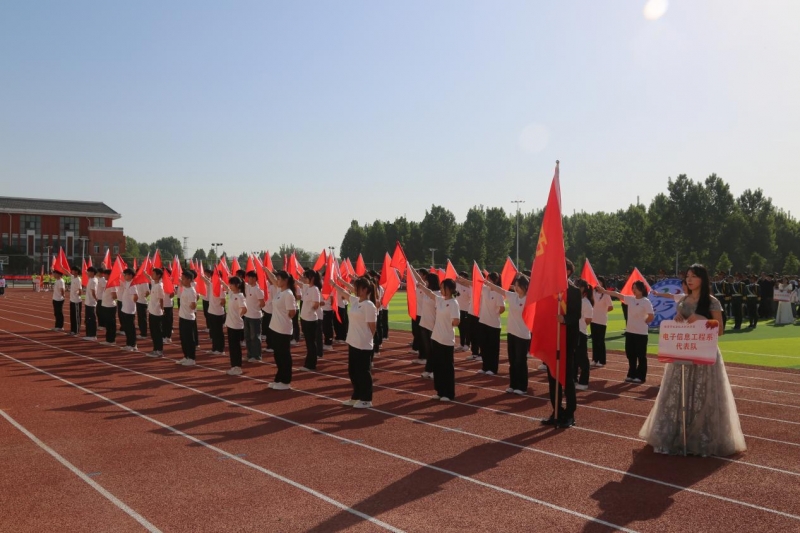 伴隨著激昂的運(yùn)動(dòng)員進(jìn)行曲,國(guó)旗隊(duì)、會(huì)徽隊(duì)、裁判員代表隊(duì)及各院系方陣依次入場(chǎng)。國(guó)旗隊(duì)6名護(hù)旗手步伐鏗鏘,展現(xiàn)青春風(fēng)采;裁判員代表隊(duì)精神抖擻,彰顯公平公正的體育精神;各院系代表隊(duì)師生意氣風(fēng)發(fā),口號(hào)嘹亮,充分展現(xiàn)了學(xué)院各院系的特色與風(fēng)采。