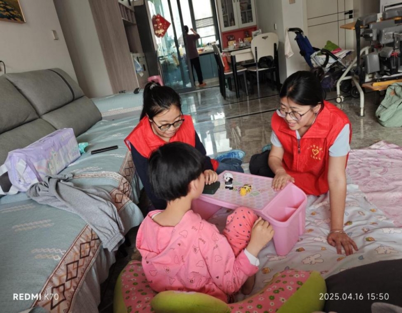 社區(qū)自習(xí)室內(nèi),志愿者為聽障兒童提供課業(yè)輔導(dǎo),以手語輔導(dǎo)、圖文教材等為橋梁,幫助孩子們跨越語言障礙掌握知識。在輔導(dǎo)中通過共讀生命繪本,引導(dǎo)孩子認(rèn)識自身獨特性,實現(xiàn)“以生命影響生命”的教育真諦。腦癱兒童家中,志愿者協(xié)同兒童康復(fù)中心每周兩次陪同孩子進(jìn)行肢體訓(xùn)練、語言干預(yù)和認(rèn)知能力開發(fā)。未保站中,音樂療愈、象棋對弈、創(chuàng)意手工為困境兒童喚醒生命更多可能。