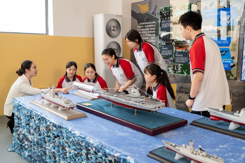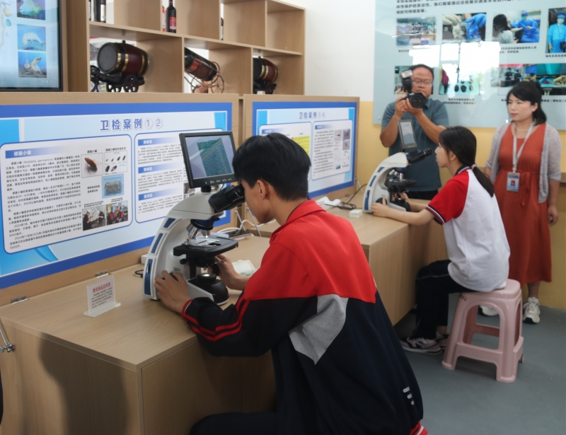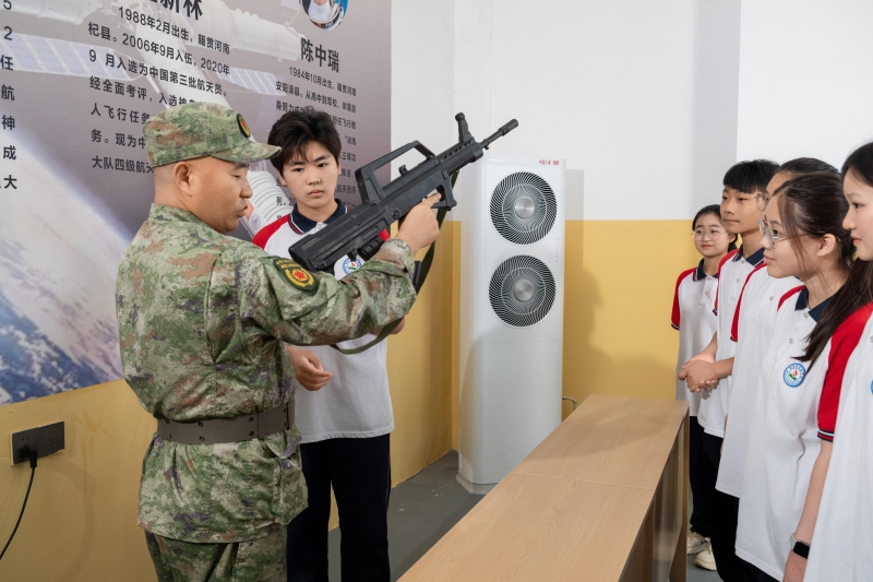 在現(xiàn)代國(guó)防區(qū),學(xué)生講解河南籍航天員事跡,戰(zhàn)斗功臣講解槍械知識(shí)、規(guī)范演示輕武器分解與組合;在國(guó)門(mén)生物安全區(qū),師生通過(guò)光學(xué)顯微鏡做微生物觀(guān)察。