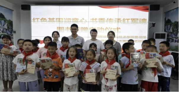 7 月 11 日下午實踐團首站抵達箭廠河村留守兒童日間照料中心,開啟了“紅 色基因潤童心書香傳承紅軍魂”圖書捐贈啟動儀式。成員們將精心挑選的兒童繪 本、科普讀物、經(jīng)典名著整齊擺放,五彩斑斕的封面瞬間吸引了孩子們的目光。 簡短的開場后,捐贈活動有序進行。拿到新書的孩子們興奮地舉起來向同伴展示, 無比喜悅地交流著書中的內容。本次活動通過圖書捐贈、閱讀分享,為留守的兒 童送上豐富的精神食糧,不僅豐富了留守兒童的暑期生活,更營造出全民閱讀的 良好氛圍。