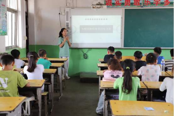 “五月鮮花開滿坡,山上山下蟬唱歌。”7月2日上午9點(diǎn),頗具民族特色的侗族大歌從蘭考縣閆樓鄉(xiāng)李西小學(xué)的一間教室傳出。這是一場“少數(shù)民族文化探索”課,張雨馨、陳思睿根據(jù)少數(shù)民族特色文化的多媒體展示,帶領(lǐng)鄉(xiāng)村孩子們走進(jìn)多彩的民族文化世界。