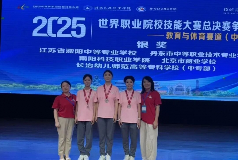 盛夏終章,捷報傳響!近日,在2025年世界職業(yè)院校技能大賽總決賽爭奪賽教育與體育賽道(中職組)中,南陽科技職業(yè)學院學前教育學院學子劉文藝、郭甜甜、劉佳美3名同學組成的幼兒保育專業(yè)代表隊,在輔導教師張鴿、王進的帶領下憑借扎實的專業(yè)技能和精彩的賽場展示,從全國63支參賽隊伍中脫穎而出,一舉摘得全國總決賽銀獎!