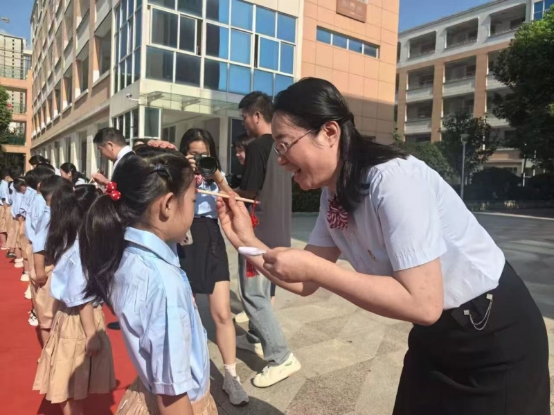 而在小學(xué)部,“入泮”儀式同樣激動人心。首先是過泮橋。一年級的新生邁著輕快的步伐,歡喜地走過泮橋。在他們的眼中,“過橋”這一活動格外新鮮有趣。其實是點朱砂。點朱砂也稱“開智”,寓意開啟智慧,心明目亮。校長和老師們?yōu)橐荒昙壍暮⒆觽凕c上朱砂,祝福他們在未來的學(xué)習(xí)中“一點即通”。最后是寫人字。一撇一捺學(xué)做人,工工整整寫人生。通過書寫最簡單的“人”字,孩子們感知學(xué)習(xí)的第一步是從學(xué)做人開始,自此踏上求知、明理的人生新階段。