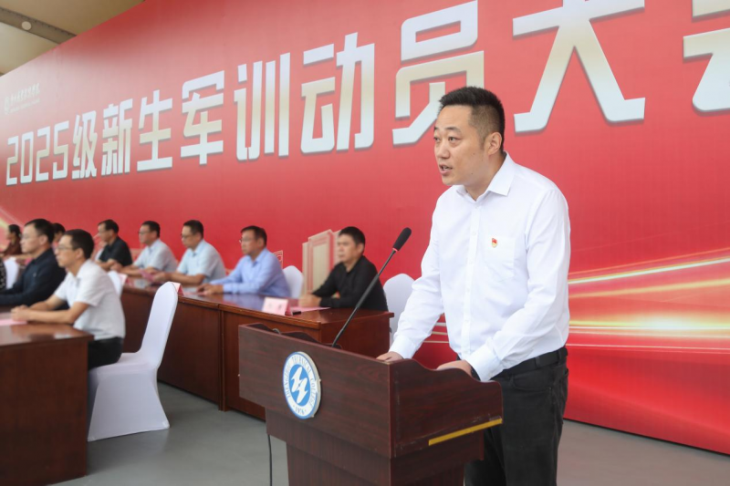 新能源汽車學院牛鑫代表輔導員老師發(fā)言。他表示全體輔導員將牢記“立德樹人”使命,以“四有好教師”標準要求自己,軍訓期間全程陪伴新生,關注思想動態(tài)與生活需求,做好嚴格管理的“引路人”和溫暖貼心的“守護者”。