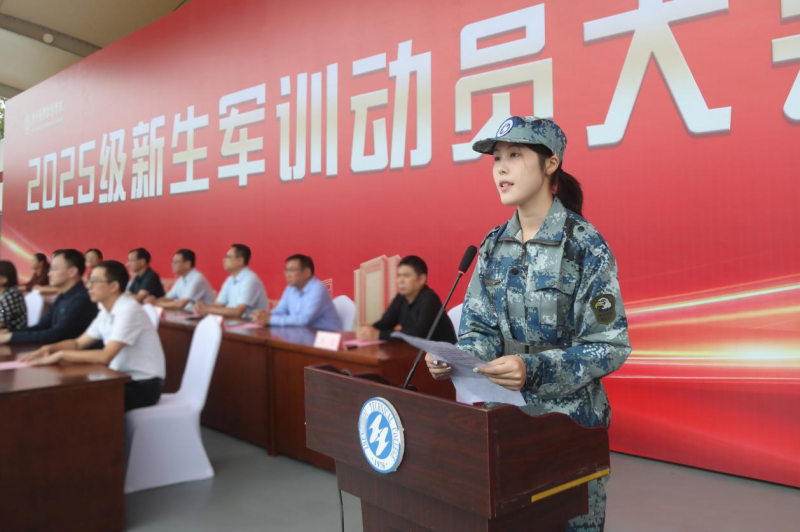 文化創(chuàng)意學院董馨允代表2025級新生發(fā)言。她表示將以飽滿熱情投入軍訓,服從指揮,不怕吃苦,團結同學,遵守紀律,展現(xiàn)2025級新生的青春風采。