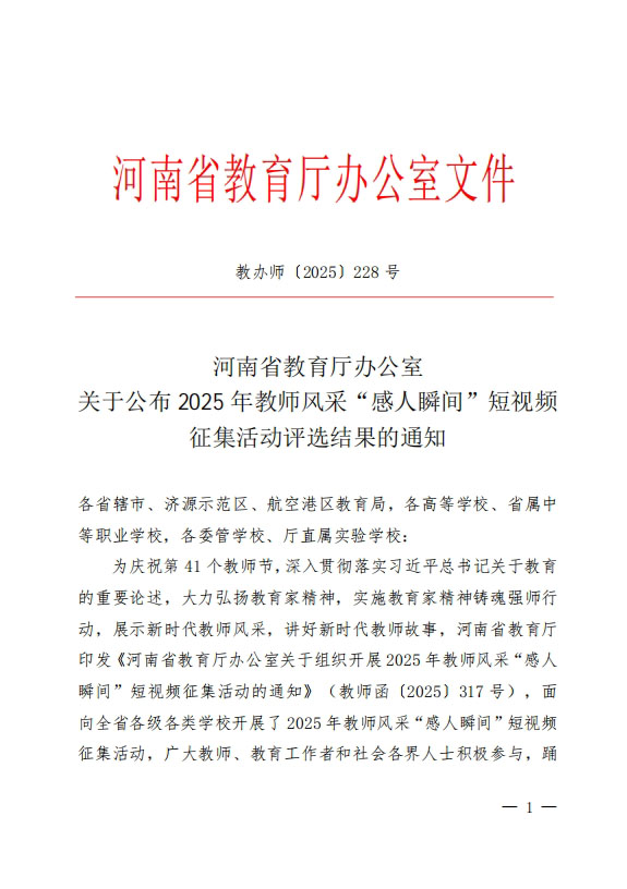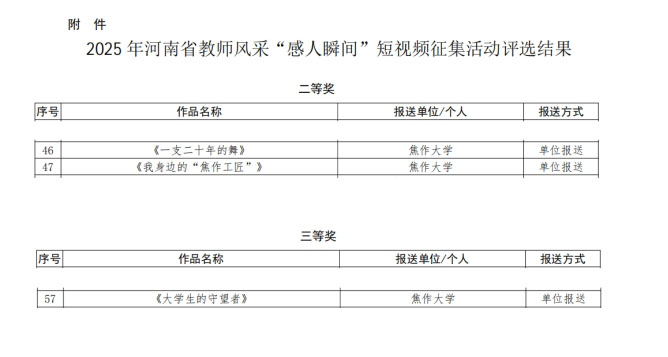 近日,河南省教育廳公布了2025年河南省教師風(fēng)采“感人瞬間”短視頻征集活動評選結(jié)果,我校藝術(shù)學(xué)院孫玲老師的作品《一支二十年的舞》、化工學(xué)院歐陽勝老師的作品《我身邊的“焦作工匠”》榮獲河南省二等獎,人文學(xué)院張屾老師的作品《大學(xué)生的守望者》榮獲河南省三等獎。