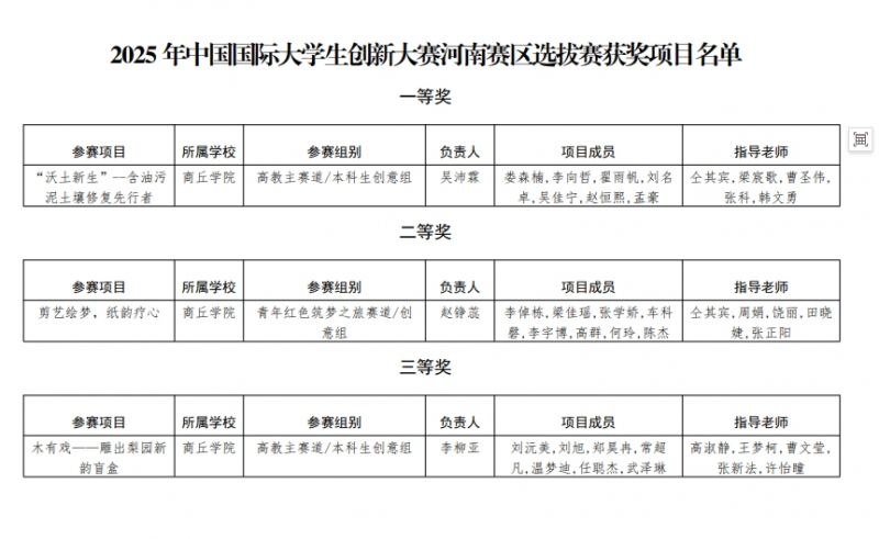近日,2025年中國國際大學(xué)生創(chuàng)新大賽河南賽區(qū)選拔賽結(jié)果出爐。商丘學(xué)院參賽團(tuán)隊(duì)?wèi){借扎實(shí)的項(xiàng)目功底、突出的創(chuàng)新價(jià)值與出色的現(xiàn)場表現(xiàn),共斬獲省級獎項(xiàng)3項(xiàng),其中一等獎1項(xiàng),在賽事中實(shí)現(xiàn)歷史新突破,充分彰顯了學(xué)校創(chuàng)新創(chuàng)業(yè)教育的扎實(shí)工作成效。