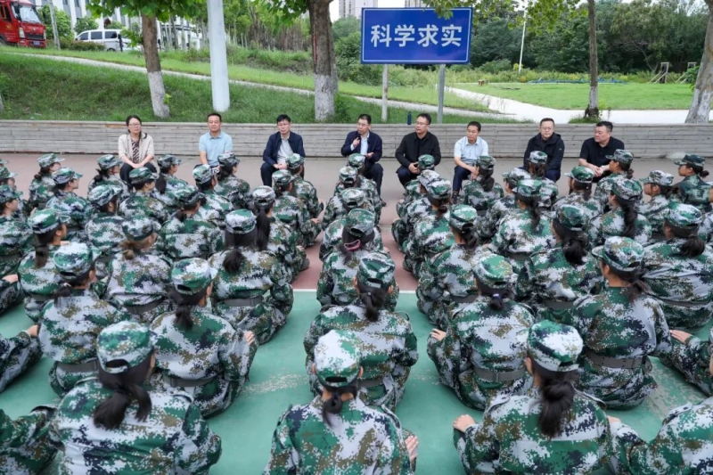 隨后,張進超與席地而坐的2025級新生代表進行了深入交流。他親切詢問同學們在軍訓中的感受、生活上的困難以及對大學生活的適應情況,認真傾聽同學們的心聲,對大家在軍訓中展現(xiàn)出的堅韌與努力給予充分肯定,并鼓勵同學們珍惜軍訓時光,磨礪意志,培養(yǎng)良好的生活和學習習慣,盡快融入大學生活,在學院這片沃土上實現(xiàn)自己的人生理想。