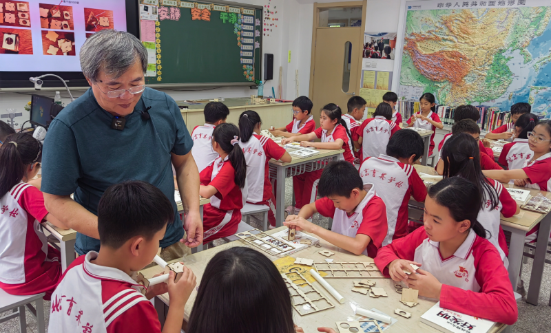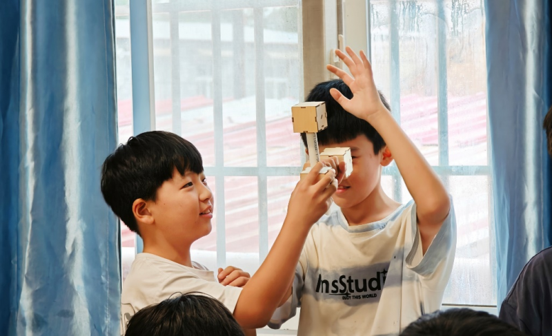 小學(xué)段課程以《制作一個窺鏡》為內(nèi)容,由高云峰教授與北京市育英學(xué)校教師邱貝貝共同指導(dǎo)。課程以《抗戰(zhàn)烽火中的好發(fā)明——戰(zhàn)法與武器》一書中“從地道照明到內(nèi)窺鏡”的發(fā)明思維大遷移切入,結(jié)合小學(xué)科學(xué)五年級上冊《光》單元中光的反射原理,引導(dǎo)學(xué)生探索光學(xué)知識在實戰(zhàn)中的運用。在實踐環(huán)節(jié),學(xué)生利用材料拼裝窺鏡,既受到抗戰(zhàn)精神的感染,又鍛煉了動手能力,啟發(fā)了創(chuàng)新思維。