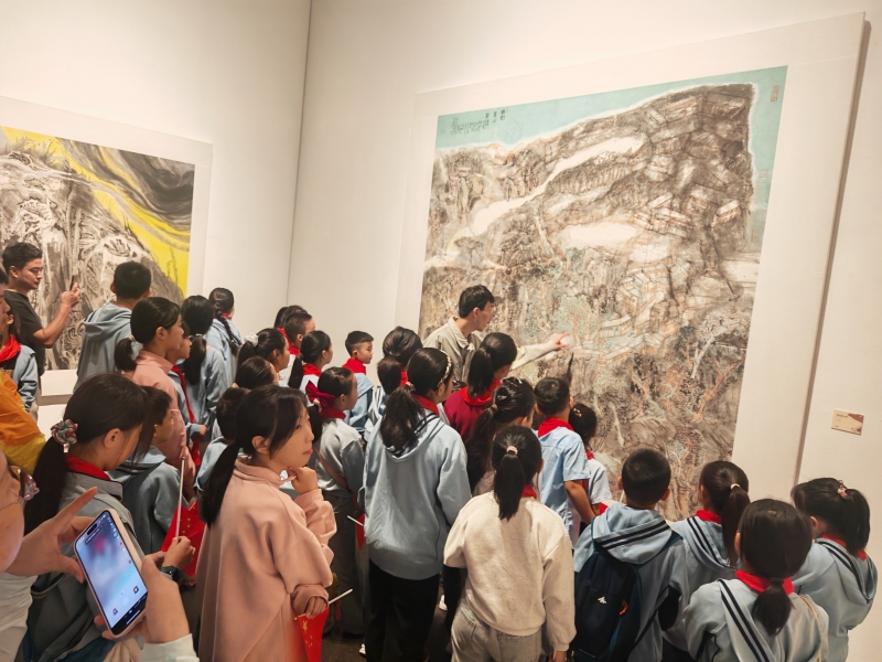 展覽現(xiàn)場(chǎng),作品題材豐富、風(fēng)格多樣,從嵩山云海的壯麗圖卷到漓江春色的柔美寫意;從科技新城的現(xiàn)代風(fēng)貌到市井生活的溫暖瞬間,生動(dòng)呈現(xiàn)了新時(shí)代中國(guó)的多元面貌與發(fā)展成就。張子軒老師現(xiàn)場(chǎng)為學(xué)生擔(dān)任講解,從創(chuàng)作背景、筆墨技法到作品內(nèi)涵,細(xì)致剖析每幅畫作。在一幅反映鄉(xiāng)村振興的作品前,他引導(dǎo)孩子們關(guān)注畫中整齊的民居與豐收的田野,并告訴大家:“這不僅是藝術(shù),更是新中國(guó)七十多年發(fā)展成就的真實(shí)縮影。”